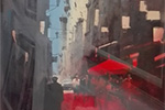 Es un cazador de tiempo, dónde convierte el soporte en estructuras claroscuristas cromáticas que van emergiendo en formas de playas, pueblos, plazas, coches, personas en movimiento, catedrales, ciclistas de ciudad, etc. Y de todo eso se responsabiliza una exultante paleta coral de azules ultramar, cerúleos, carmines, rojos de cadmio, sienas tostadas, ocres amarillos, verdes, naranjas y precisos toques de blancos de China que ajustan algunas luces para reforzar los contrastes de mayor luz.
