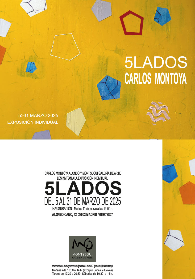 En la exposición 5LADOS, el artista madrileño Carlos Montoya (1964) presenta el proyecto plástico con el que lleva comprometido los últimos años. Se trata de una decidida apuesta por ahondar en las posibilidades artísticas de una forma tan sencilla como la del pentágono, teniendo como único límite la capacidad autorreferencial de la pintura. Profundizar en ese marco que se ha impuesto a sí mismo es la metodología de un trabajo artístico que es una búsqueda personal. Los cuadros expuestos son, en realidad, propuestas abiertas sobre un amplio arco que va desde la geometría, dura y nítida, a los matices líricos infinitos del gesto pictórico, extremos que se conjugan de múltiples maneras. Por un lado, se presentan composiciones basadas en redes más o menos compactas en las que somete la materia y el color a retóricas diversas. El artista también exhibe obras donde las figuras elementales se mueven con aparente libertad, pero en las que nunca desaparecen las retículas, como un fondo subyacente y estructurador. Además, nos propone versiones mucho más gestuales, que deforman y rompen la geometría en favor de una expresión enérgica y a veces airada. En definitiva, la exposición revela líneas de acción plástica comprometidas con una investigación muy personal y, sobre todo, refleja un compromiso artístico sin concesiones.
