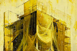 Este movimiento tácito, sugerido a través de los pliegues efectistas de las telas protectoras que cuelgan de los andamios -un montaje casi escenográfico- y de los perfiles de las grúas torre, impregna a la obra de un sentido original, transmitiendo la sensación de frenesí, de un proyecto en proceso, de una idea que se ampara en el futuro para darnos a entender que todo está por hacer, que existen nuevas posibilidades y que éstas están en nuestras manos. Piezas construidas por capas, por pisos, por tiempos de acción, por la sublime idea del por-venir.