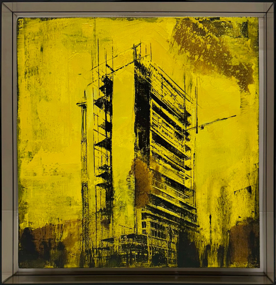 Es licenciada en Historia del Arte y Bellas Artes por la Universidad de Salamanca desde 2004. C.A.P. 2005. Ha realizado los cursos del Doctorado "Situación del arte en el momento actual", bienio 2004- 2006, en la misma Universidad. En el 2006-07 reside como becaria en la Fundación Antonio Gala para Jóvenes Creadores .Ha cumplimentado su formación con estudios en el Conservatorio Profesional de Música de Salamanca (1988-2001) y la Escuela de Nobles y Bellas Artes de San Eloy (1998-2001).“Master de Museografía y Gestión de Exposiciones” IART (Madrid). En esta muestra de Belén Cobaleda García-Bernalt, en sus cuadros la arquitectura aparece como un organismo en proceso: estructuras elevándose, andamios, grúas y veladuras que sugieren un “estado de obra” permanente. Sus composiciones, construidas con un dibujo incisivo y capas de materia, convierten el edificio en huella y en mapa: líneas técnicas, ritmos de fachada y transparencias que dejan ver lo que normalmente permanece oculto. La incorporación de óxidos —como una pátina viva— introduce el tiempo y la corrosión como lenguaje, tensando la frialdad del hormigón con una dimensión orgánica y casi táctil. Entre gamas industriales (grises, negros, blancos) y estallidos cromáticos (amarillos intensos, verdes esmeralda), Cobaleda desplaza la mirada del “resultado” al “proceso”: la ciudad no como postal, sino como devenir, cicatriz y transformación. Así, sus obras funcionan como metáforas del crecimiento contemporáneo, donde la promesa de lo nuevo convive con la fragilidad de lo inacabado.