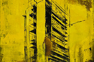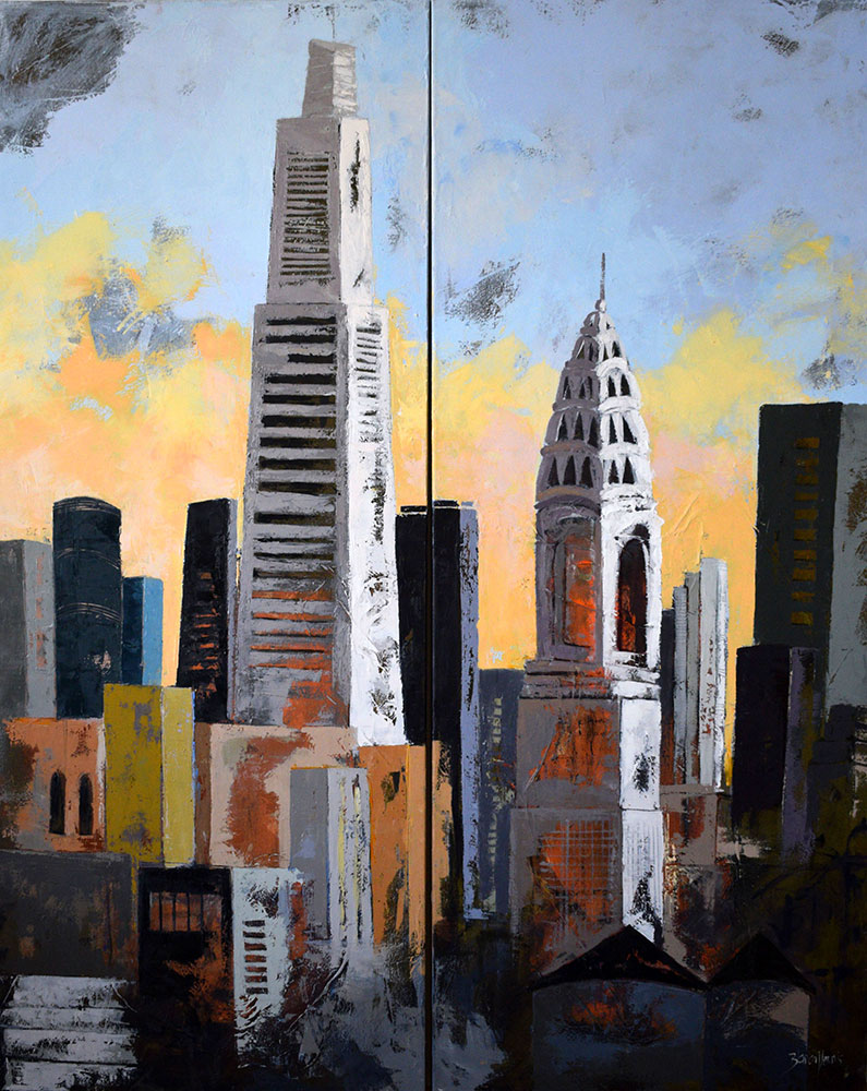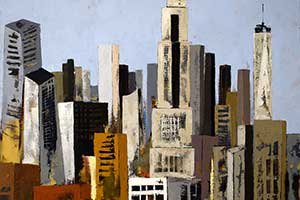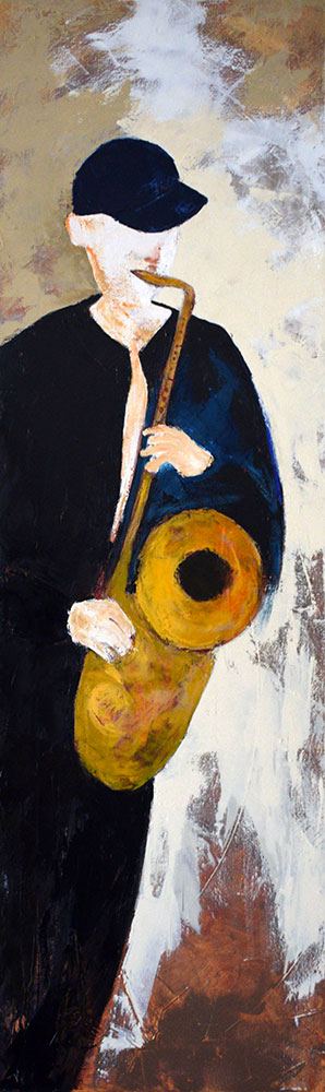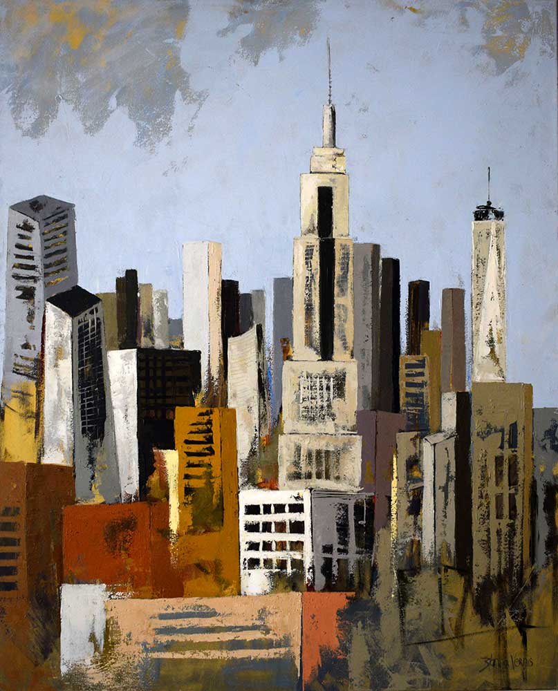 Blanca Vernis Domènech propone una poética urbana donde la arquitectura se convierte en ritmo: rascacielos esquemáticos y volúmenes densos emergen entre veladuras, raspados y una paleta de blancos, grises y negros atravesada por ocres y amarillos de atardecer. La materia deja huella y sugiere tiempo, memoria y atmósfera. En paralelo, la figura del músico —casi anónima— introduce el pulso humano: el saxofón dorado actúa como foco y metáfora de una voz que hace vibrar la ciudad.