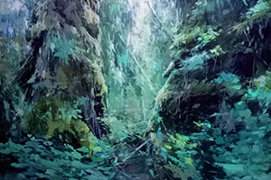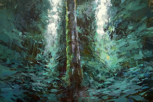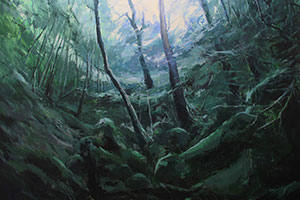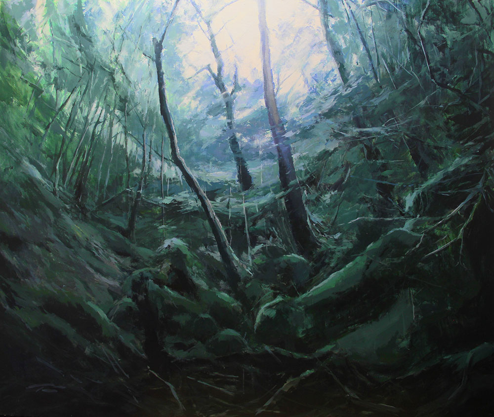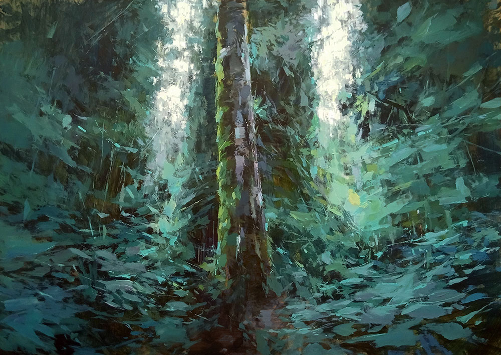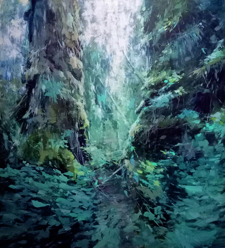 En esta serie, Miguel Carlos Montesinos aborda el bosque como una experiencia más que como una representación: la naturaleza aparece como un campo de fuerzas en tensión, donde la luz irrumpe en verticales casi físicas y la vegetación se construye a base de gestos rápidos, capas superpuestas y ráfagas de color. El camino apenas insinuado, actúa como eje de profundidad y de búsqueda, invitando a entrar en una atmósfera densa, húmeda, vibrante, en la que cada trazo parece registrar un pulso: viento, agua, sombra, respiración. La paleta de verdes, turquesas y negros, atravesada por claros intensos, convierte el paisaje en un umbral emocional; no se mira desde fuera, se atraviesa. Así, la pintura se vuelve un acto de inmersión: materia, energía y memoria del lugar reunidas en una misma vibración.